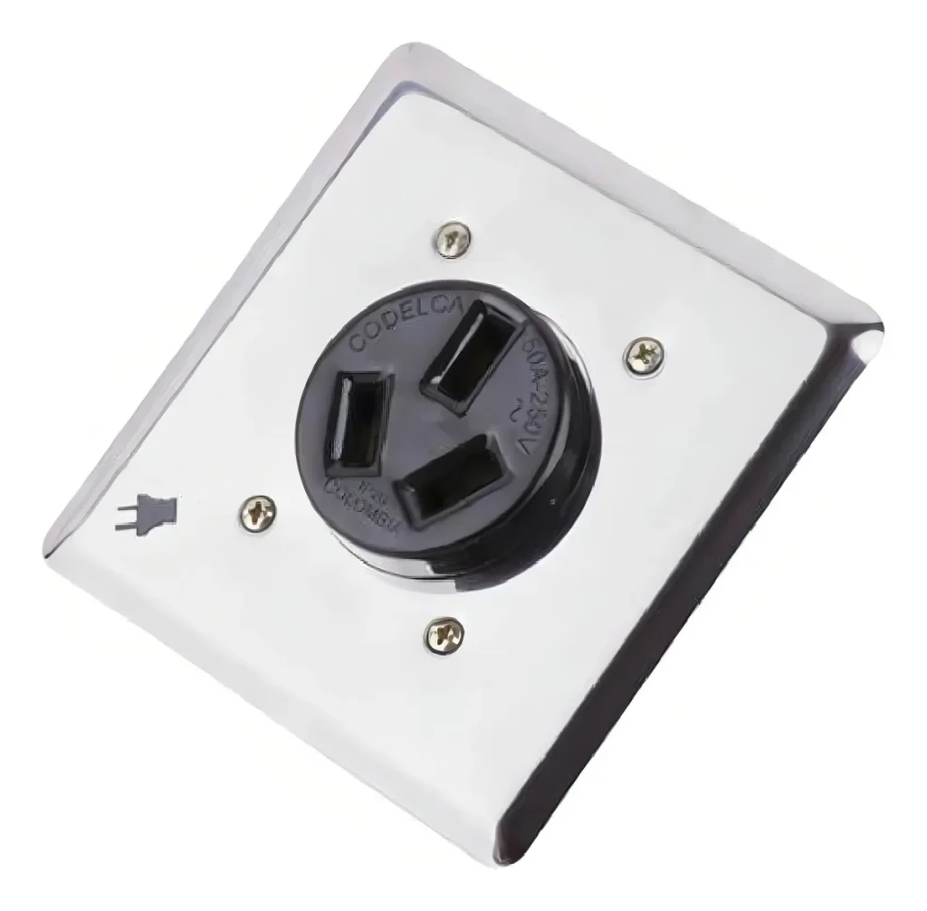 Tomacorriente trifilar empotrable fabricado en bakelita resistente al calor y contactos en cobre de alta capacidad conductiva. Tapa en acero inoxidable. Diseñado para soportar corrientes hasta 50 A en 250 V~, indicado para maquinaria y equipos eléctricos de alto consumo en aplicaciones industriales.