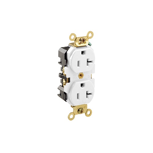 Tomacorriente doble L/T NEMA 5-20R 20A 125V blanco, configuracion tipo T compatible con enchufes 5-15P y 5-20P. Construido en nylon de alto impacto con contactos de laton reforzado que proporcionan firme retencion y excelente conductividad. Conexion lateral mediante tornillos de acero y puesta a tierra automatica. Certificado bajo UL 498. Ideal para circuitos dedicados de 20 amperios en oficinas, cocinas comerciales, talleres y areas tecnicas donde se requiere mayor capacidad de corriente. Ofrece estabilidad termica y mecanica frente a uso frecuente y cargas continuas.